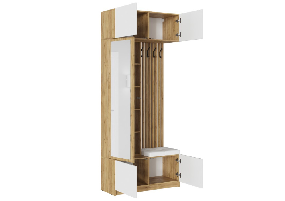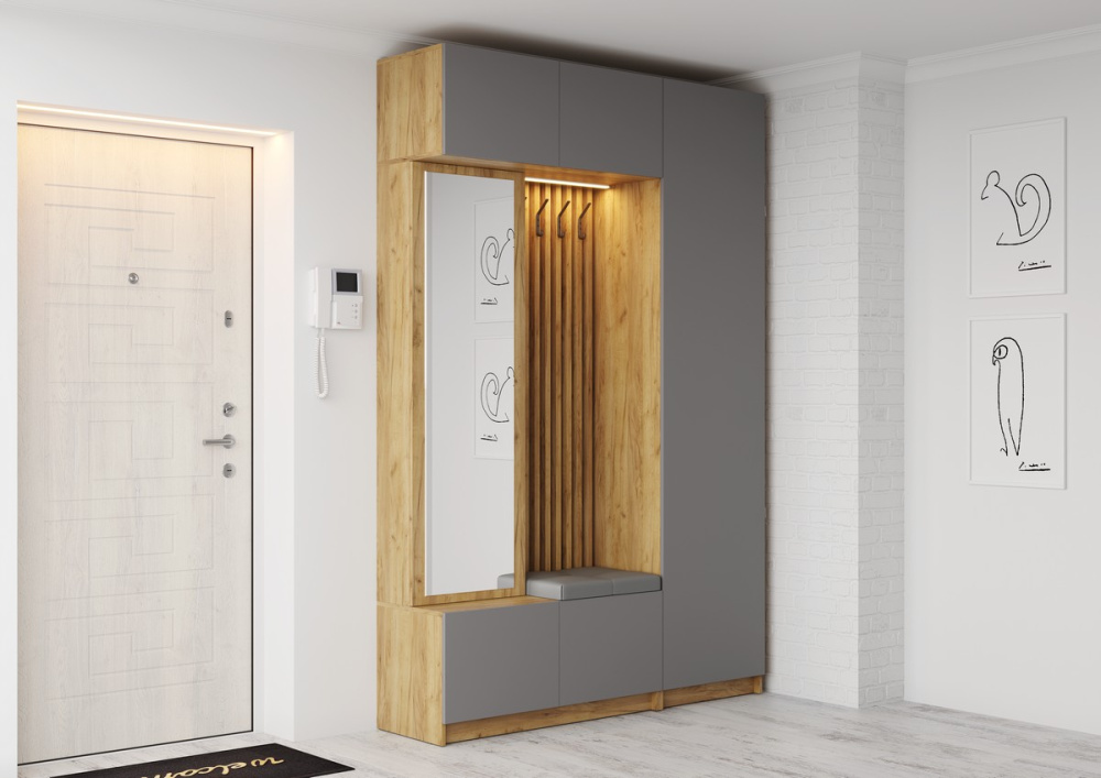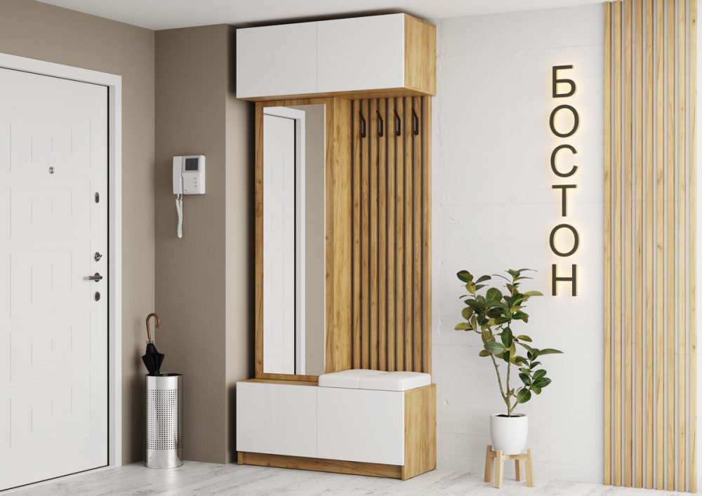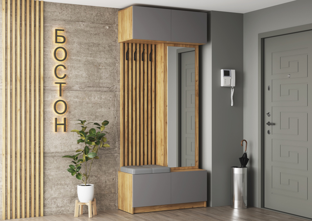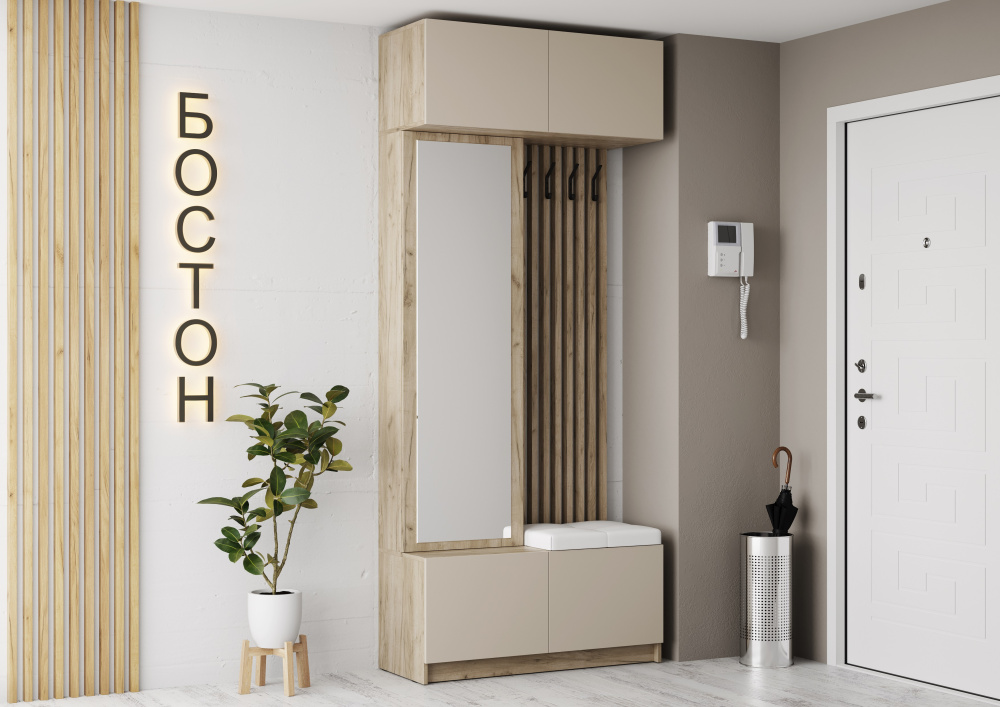 Выполненная в скандинавском стиле прихожая «Бостон» состоит из навесной антресоли, вместительной напольной тумбы, шкафа-пенала с зеркалом, а также из стильной стенки-вешалки, выполненной из профилей. Гарнитур «Бостон» - находка для небольших прихожих.